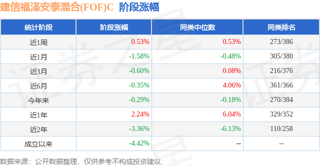 从业绩表现来看,建信福泽安泰混合(FOF)C基金过去一年净值涨幅为1.18%,在同类基金中排名292/341,同类基金过去一年净值涨幅中位数为3.76%。而基金过去一年的最大回撤为-4.89%,成立以来的最大回撤为-9.38%。