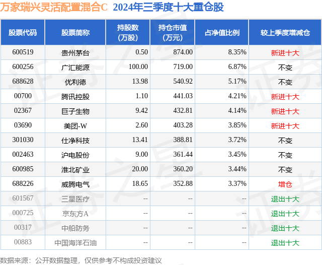 从基金规模来看,万家瑞兴灵活配置混合C基金2024年三季度公布的基金规模为0.0亿元,较上一期规模18.01万元变化了-0.84万元,环比变化了-4.69%。该基金最新一期资产配置为:股票占净值比91.29%,债券占净值比0.92%,现金占净值比3.99%。从基金持仓来看,该基金当季前十大股票仓位达46.57%,第一大重仓股为贵州茅台(600519),持仓占比为8.35%。