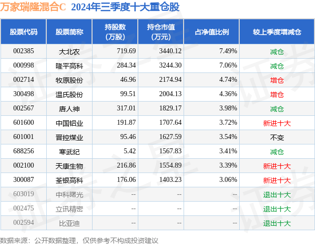 从基金规模来看,万家瑞隆混合C基金2024年三季度公布的基金规模为0.31亿元,较上一期规模4339.26万元变化了-1232.49万元,环比变化了-28.4%。该基金最新一期资产配置为:股票占净值比86.8%,无债券类资产,现金占净值比13.39%。从基金持仓来看,该基金当季前十大股票仓位达44.75%,第一大重仓股为大北农(002385),持仓占比为7.49%。