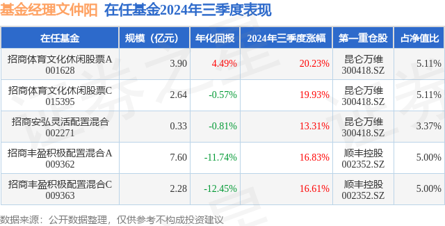 从基金规模来看,招商体育文化休闲股票C基金2024年三季度公布的基金规模为2.64亿元,较上一期规模2.57亿元变化了675.49万元,环比变化了2.63%。该基金最新一期资产配置为:股票占净值比92.39%,债券占净值比3.54%,现金占净值比3.7%。从基金持仓来看,该基金当季前十大股票仓位达38.19%,第一大重仓股为昆仑万维(300418),持仓占比为5.11%。