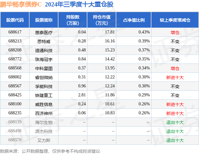 从基金规模来看,鹏华畅享债券C基金2024年三季度公布的基金规模为0.0亿元,较上一期规模97.08万元变化了-59.2万元,环比变化了-60.98%。该基金最新一期资产配置为:股票占净值比10.48%,债券占净值比95.58%,现金占净值比8.98%。从基金持仓来看,该基金当季前十大股票仓位达3.29%,第一大重仓股为惠泰医疗(688617),持仓占比为0.43%。