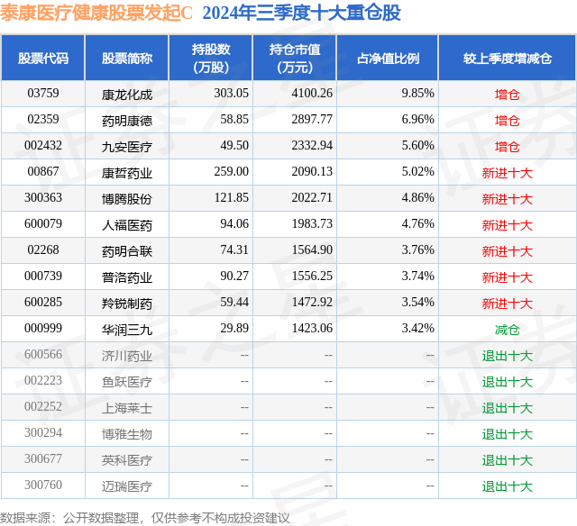 从基金规模来看,泰康医疗健康股票发起C基金2024年三季度公布的基金规模为1.95亿元,较上一期规模1.69亿元变化了2648.53万元,环比变化了15.68%。该基金最新一期资产配置为:股票占净值比81.03%,无债券类资产,现金占净值比9.3%。从基金持仓来看,该基金当季前十大股票仓位达51.51%,第一大重仓股为康龙化成(03759),持仓占比为9.85%。