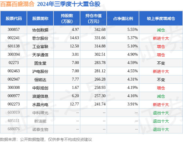 从基金规模来看,百嘉百盛混合基金2024年三季度公布的基金规模为0.62亿元,较上一期规模5760.31万元变化了417.95万元,环比变化了7.26%。该基金最新一期资产配置为:股票占净值比89.16%,无债券类资产,现金占净值比7.37%。从基金持仓来看,该基金当季前十大股票仓位达46.63%,第一大重仓股为协创数据(300857),持仓占比为5.55%。