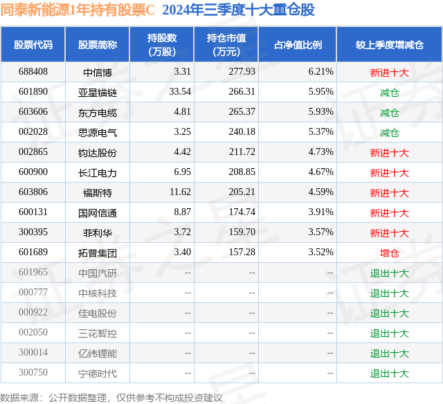 从基金规模来看,同泰新能源1年持有股票C基金2024年三季度公布的基金规模为0.13亿元,较上一期规模1309.34万元变化了33.68万元,环比变化了2.57%。该基金最新一期资产配置为:股票占净值比81.74%,无债券类资产,现金占净值比0.76%。从基金持仓来看,该基金当季前十大股票仓位达48.45%,第一大重仓股为中信博(688408),持仓占比为6.21%。