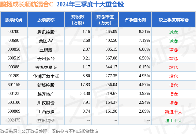 从基金规模来看,鹏扬成长领航混合C基金2024年三季度公布的基金规模为0.21亿元,较上一期规模1802.73万元变化了259.9万元,环比变化了14.42%。该基金最新一期资产配置为:股票占净值比92.62%,债券占净值比5.44%,现金占净值比2.8%。从基金持仓来看,该基金当季前十大股票仓位达54.36%,第一大重仓股为腾讯控股(00700),持仓占比为8.31%。