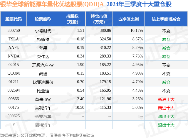 从基金规模来看,银华全球新能源车量化优选股票(QDII)A基金2024年三季度公布的基金规模为0.21亿元,较上一期规模1880.49万元变化了189.49万元,环比变化了10.08%。该基金最新一期资产配置为:股票占净值比93.09%,无债券类资产,现金占净值比7.93%。从基金持仓来看,该基金当季前十大股票仓位达60.27%,第一大重仓股为宁德时代(300750),持仓占比为10.17%。