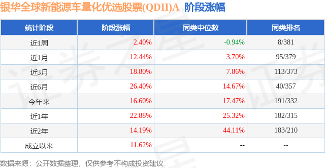 从业绩表现来看,银华全球新能源车量化优选股票(QDII)A基金过去一年净值涨幅为22.88%,在同类基金中排名182/315,同类基金过去一年净值涨幅中位数为25.32%。而基金过去一年的最大回撤为-16.37%,成立以来的最大回撤为-32.65%。