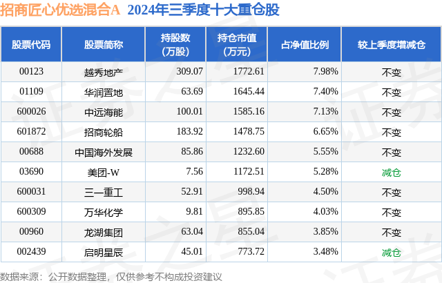 从基金规模来看,招商匠心优选混合A基金2024年三季度公布的基金规模为0.95亿元,较上一期规模8842.55万元变化了649.76万元,环比变化了7.35%。该基金最新一期资产配置为:股票占净值比92.58%,债券占净值比6.4%,现金占净值比1.64%。从基金持仓来看,该基金当季前十大股票仓位达55.85%,第一大重仓股为越秀地产(00123),持仓占比为7.98%。