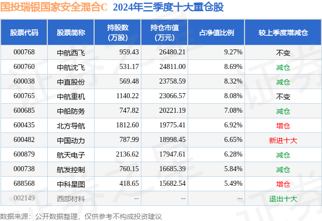 从基金规模来看,国投瑞银国家安全混合C基金2024年三季度公布的基金规模为2.25亿元,较上一期规模1.7亿元变化了5584.99万元,环比变化了32.95%。该基金最新一期资产配置为:股票占净值比94.63%,债券占净值比0.18%,现金占净值比4.9%。从基金持仓来看,该基金当季前十大股票仓位达72.62%,第一大重仓股为中航西飞(000768),持仓占比为9.27%。