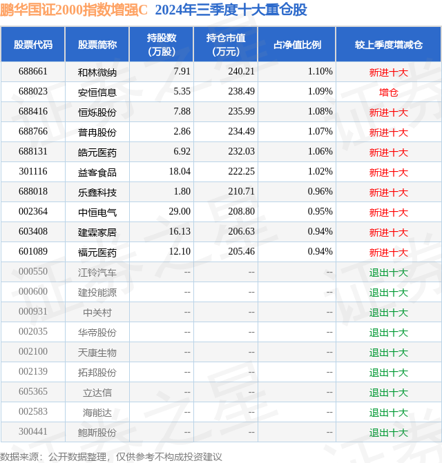 从基金规模来看,鹏华国证2000指数增强C基金2024年三季度公布的基金规模为1.08亿元,较上一期规模1.01亿元变化了675.03万元,环比变化了6.67%。该基金最新一期资产配置为:股票占净值比93.61%,无债券类资产,现金占净值比6.75%。从基金持仓来看,该基金当季前十大股票仓位达10.21%,第一大重仓股为和林微纳(688661),持仓占比为1.1%。