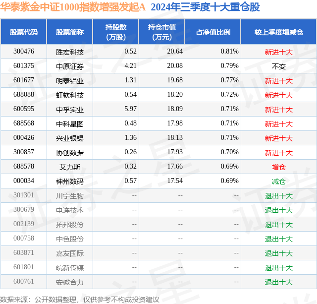 从基金规模来看,华泰紫金中证1000指数增强发起A基金2024年三季度公布的基金规模为0.1亿元,较上一期规模874.92万元变化了121.35万元,环比变化了13.87%。该基金最新一期资产配置为:股票占净值比94.31%,债券占净值比3.99%,现金占净值比2.59%。从基金持仓来看,该基金当季前十大股票仓位达7.3%,第一大重仓股为胜宏科技(300476),持仓占比为0.81%。