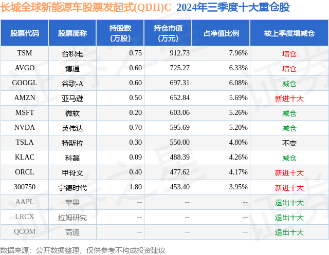 证券之星消息,日前长城全球新能源车股票发起式(QDII)C基金公布三季报,2024年三季度最新规模0.85亿元,季度净值涨幅为-2.02%。