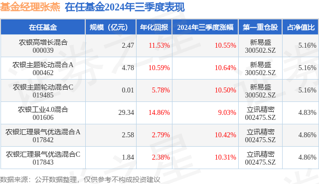 农银汇理景气优选混合C现任基金经理为张燕。其中在任基金经理张燕已从业7年又221天,2023年2月23日正式接手管理农银汇理景气优选混合C,任职期间累计回报为4.01%。目前还管理着6只基金产品(包括A类和C类),其中本季度表现最佳的基金为农银主题轮动混合A(000462),季度净值涨幅为10.64%。