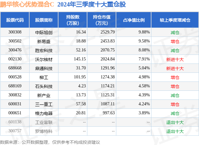 从基金规模来看,鹏华核心优势混合C基金2024年三季度公布的基金规模为0.01亿元,较上一期规模60.6万元变化了10.72万元,环比变化了17.68%。该基金最新一期资产配置为:股票占净值比92.1%,无债券类资产,现金占净值比9.48%。从基金持仓来看,该基金当季前十大股票仓位达62.57%,第一大重仓股为中际旭创(300308),持仓占比为9.88%。