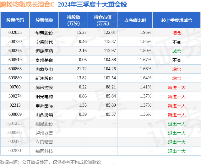 从基金规模来看,鹏扬均衡成长混合C基金2024年三季度公布的基金规模为0.12亿元,较上一期规模1067.25万元变化了120.77万元,环比变化了11.32%。该基金最新一期资产配置为:股票占净值比82.04%,债券占净值比9.37%,现金占净值比11.09%。从基金持仓来看,该基金当季前十大股票仓位达16.08%,第一大重仓股为华帝股份(002035),持仓占比为1.95%。