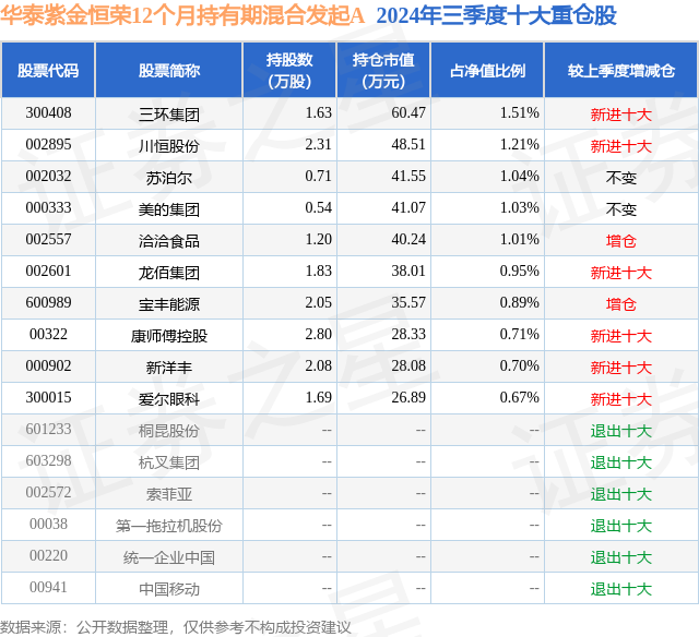从基金规模来看,华泰紫金恒荣12个月持有期混合发起A基金2024年三季度公布的基金规模为0.16亿元,较上一期规模1759.39万元变化了-141.56万元,环比变化了-8.05%。该基金最新一期资产配置为:股票占净值比16.18%,债券占净值比91.88%,现金占净值比3.18%。从基金持仓来看,该基金当季前十大股票仓位达9.72%,第一大重仓股为三环集团(300408),持仓占比为1.51%。