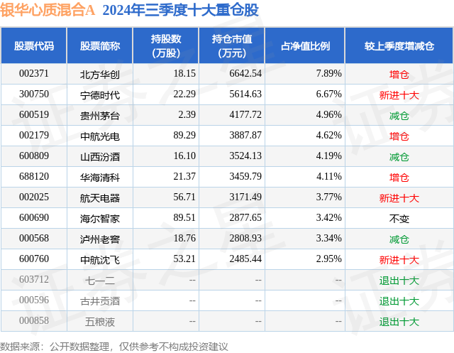 从基金规模来看,银华心质混合A基金2024年三季度公布的基金规模为3.23亿元,较上一期规模3.0亿元变化了2361.71万元,环比变化了7.88%。该基金最新一期资产配置为:股票占净值比93.78%,无债券类资产,现金占净值比6.09%。从基金持仓来看,该基金当季前十大股票仓位达45.92%,第一大重仓股为北方华创(002371),持仓占比为7.89%。
