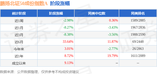 从业绩表现来看,鹏扬北证50成份指数A基金过去一年净值涨幅为61.95%,在同类基金中排名17/1981,同类基金过去一年净值涨幅中位数为13.77%。而基金过去一年的最大回撤为-42.14%,成立以来的最大回撤为-42.14%。