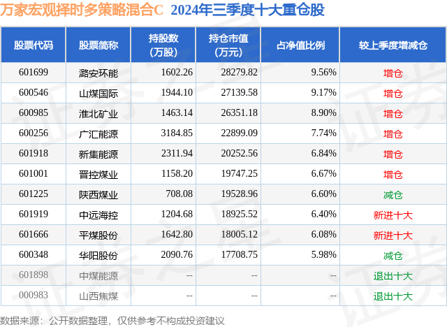 从基金规模来看,万家宏观择时多策略混合C基金2024年三季度公布的基金规模为6.15亿元,较上一期规模7.31亿元变化了-1.16亿元,环比变化了-15.85%。该基金最新一期资产配置为:股票占净值比85.86%,无债券类资产,现金占净值比7.63%。从基金持仓来看,该基金当季前十大股票仓位达73.94%,第一大重仓股为潞安环能(601699),持仓占比为9.56%。