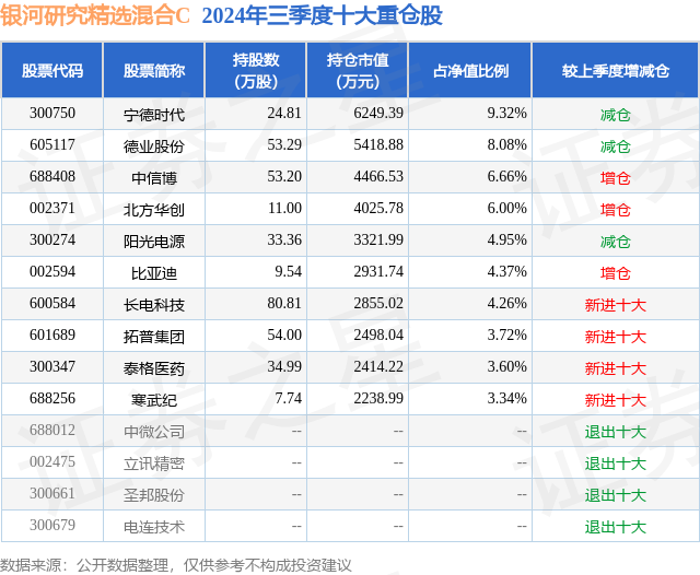 从基金规模来看,银河研究精选混合C基金2024年三季度公布的基金规模为0.0亿元,较上一期规模2.61万元变化了0.79万元,环比变化了30.36%。该基金最新一期资产配置为:股票占净值比89.73%,无债券类资产,现金占净值比9.79%。从基金持仓来看,该基金当季前十大股票仓位达54.3%,第一大重仓股为宁德时代(300750),持仓占比为9.32%。