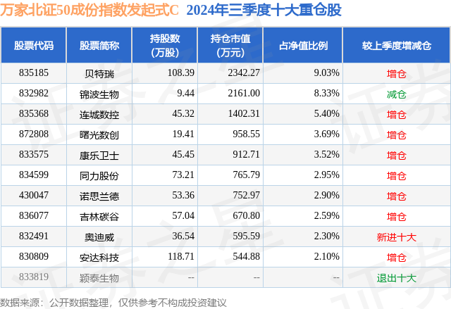 证券之星消息,日前万家北证50成份指数发起式C基金公布三季报,2024年三季度最新规模2.03亿元,季度净值涨幅为20.46%。