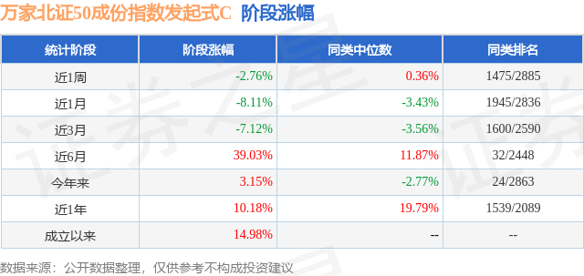从业绩表现来看,万家北证50成份指数发起式C基金过去一年净值涨幅为67.52%,在同类基金中排名10/1981,同类基金过去一年净值涨幅中位数为13.77%。而基金过去一年的最大回撤为-44.01%,成立以来的最大回撤为-44.01%。