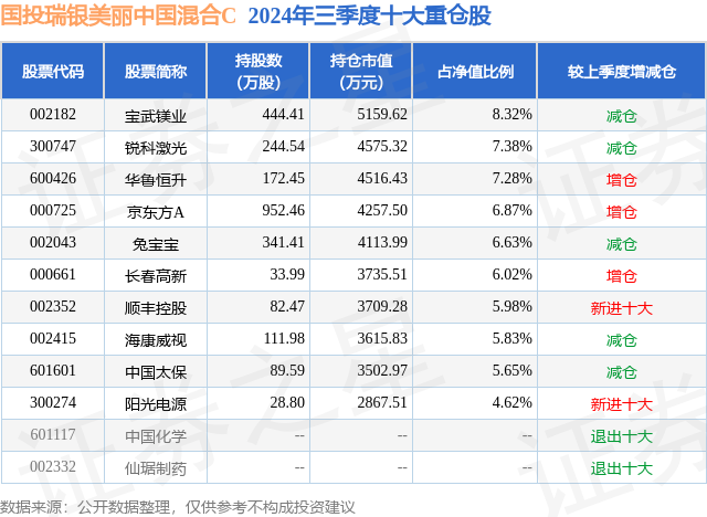 从基金规模来看,国投瑞银美丽中国混合C基金2024年三季度公布的基金规模为0.19亿元,较上一期规模1741.69万元变化了166.96万元,环比变化了9.59%。该基金最新一期资产配置为:股票占净值比91.51%,无债券类资产,现金占净值比18.66%。从基金持仓来看,该基金当季前十大股票仓位达64.58%,第一大重仓股为宝武镁业(002182),持仓占比为8.32%。