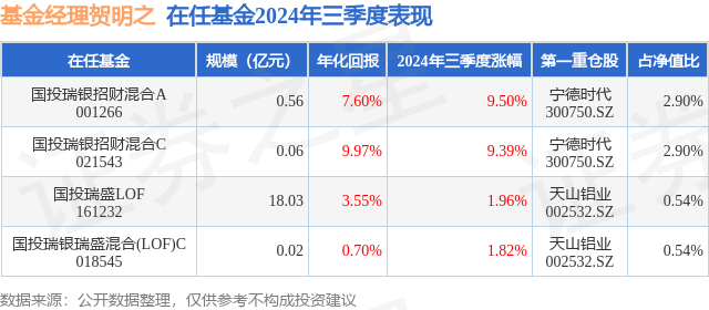 国投瑞银瑞盛混合(LOF)C现任基金经理为贺明之。其中在任基金经理贺明之已从业2年又43天,2023年5月31日正式接手管理国投瑞银瑞盛混合(LOF)C,任职期间累计回报为0.98%。目前还管理着4只基金产品(包括A类和C类),其中本季度表现最佳的基金为国投瑞银招财混合A(001266),季度净值涨幅为9.5%。