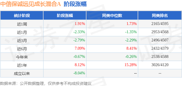 从业绩表现来看,中信保诚远见成长混合A基金过去一年净值涨幅为-0.14%,在同类基金中排名2948/3979,同类基金过去一年净值涨幅中位数为5.4%。而基金过去一年的最大回撤为-21.9%,成立以来的最大回撤为-22.44%。