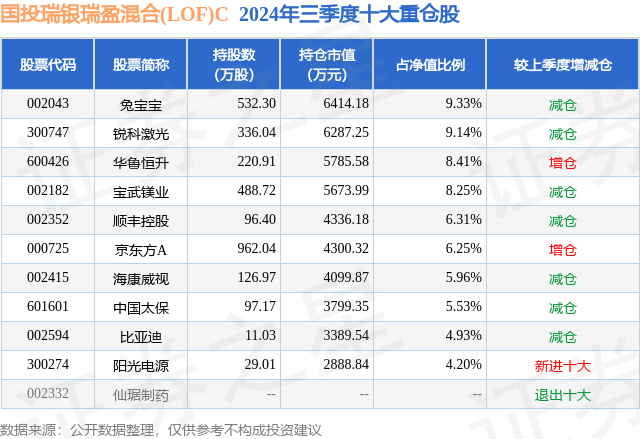 从基金规模来看,国投瑞银瑞盈混合(LOF)C基金2024年三季度公布的基金规模为0.0亿元,较上一期规模5209.11万元变化了-5201.9万元,环比变化了-99.86%。该基金最新一期资产配置为:股票占净值比92.9%,无债券类资产,现金占净值比17.15%。从基金持仓来看,该基金当季前十大股票仓位达68.31%,第一大重仓股为兔宝宝(002043),持仓占比为9.33%。