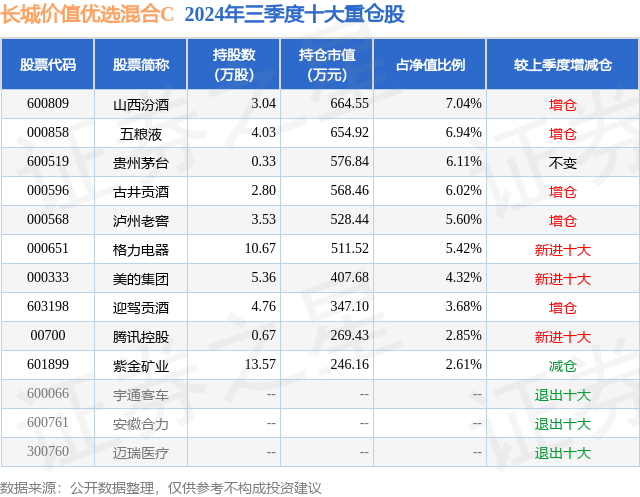 从基金规模来看,长城价值优选混合C基金2024年三季度公布的基金规模为0.0亿元,较上一期规模0.86万元变化了1.9万元,环比变化了220.36%。该基金最新一期资产配置为:股票占净值比92.12%,无债券类资产,现金占净值比7.74%。从基金持仓来看,该基金当季前十大股票仓位达50.59%,第一大重仓股为山西汾酒(600809),持仓占比为7.04%。
