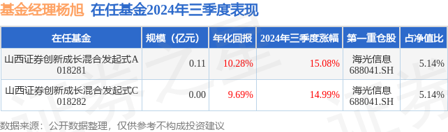 从基金规模来看,山西证券创新成长混合发起式C基金2024年三季度公布的基金规模为0.0亿元,较上一期规模15.9万元变化了-9.33万元,环比变化了-58.68%。该基金最新一期资产配置为:股票占净值比85.66%,无债券类资产,现金占净值比1.68%。从基金持仓来看,该基金当季前十大股票仓位达39.1%,第一大重仓股为海光信息(688041),持仓占比为5.14%。