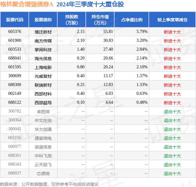 从基金规模来看,格林聚合增强债券A基金2024年三季度公布的基金规模为0.0亿元,较上一期规模0.01万元变化了0.01万元,环比变化了111.87%。该基金最新一期资产配置为:股票占净值比19.88%,债券占净值比83.74%,现金占净值比1.29%。从基金持仓来看,该基金当季前十大股票仓位达19.88%,第一大重仓股为博迁新材(605376),持仓占比为5.79%。