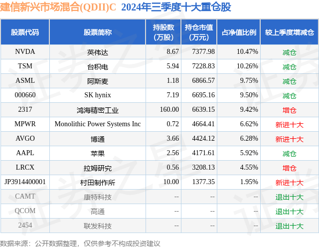 从基金规模来看,建信新兴市场混合(QDII)C基金2024年三季度公布的基金规模为4.03亿元,较上一期规模6.29亿元变化了-2.26亿元,环比变化了-35.97%。该基金最新一期资产配置为:股票占净值比80.83%,无债券类资产,现金占净值比18.1%。从基金持仓来看,该基金当季前十大股票仓位达74.72%,第一大重仓股为英伟达(NVDA),持仓占比为10.47%。