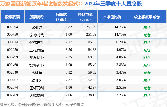 从基金规模来看,万家国证新能源车电池指数发起式C基金2024年三季度公布的基金规模为0.06亿元,较上一期规模454.08万元变化了153.48万元,环比变化了33.8%。该基金最新一期资产配置为:股票占净值比86.82%,无债券类资产,现金占净值比5.95%。从基金持仓来看,该基金当季前十大股票仓位达59.83%,第一大重仓股为比亚迪(002594),持仓占比为14.75%。