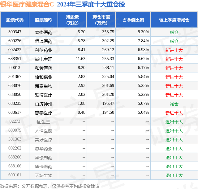 从基金规模来看,银华医疗健康混合C基金2024年三季度公布的基金规模为0.14亿元,较上一期规模1326.59万元变化了58.9万元,环比变化了4.44%。该基金最新一期资产配置为:股票占净值比91.62%,无债券类资产,现金占净值比8.29%。从基金持仓来看,该基金当季前十大股票仓位达63.31%,第一大重仓股为泰格医药(300347),持仓占比为9.3%。