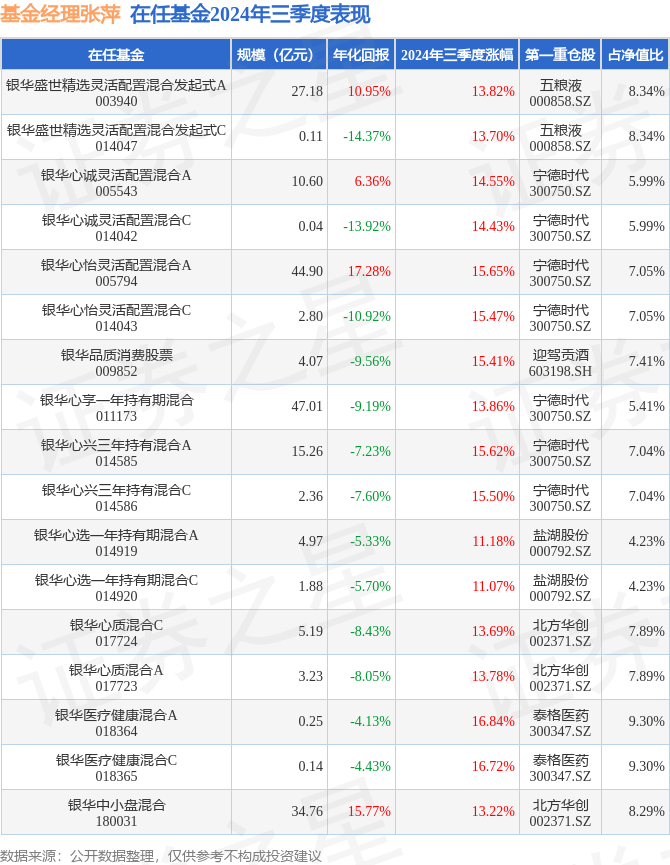 银华医疗健康混合C现任基金经理为张萍 王璐。其中在任基金经理张萍已从业5年又356天,2023年9月6日正式接手管理银华医疗健康混合C,任职期间累计回报为-5.02%。目前还管理着17只基金产品(包括A类和C类),其中本季度表现最佳的基金为银华医疗健康混合A(018364),季度净值涨幅为16.84%。