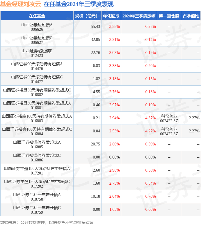 山西证券裕鑫180天持有期债券发起式A现任基金经理为刘凌云 严撼。其中在任基金经理刘凌云已从业7年又48天,2023年3月8日正式接手管理山西证券裕鑫180天持有期债券发起式A,任职期间累计回报为4.86%。目前还管理着15只基金产品(包括A类和C类),其中本季度表现最佳的基金为山西证券裕鑫180天持有期债券发起式A(016883),季度净值涨幅为4.37%。