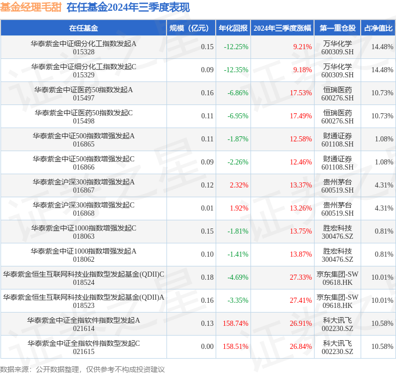 证券之星消息,日前华泰紫金中证500指数增强发起A基金公布三季报,2024年三季度最新规模0.11亿元,季度净值涨幅为12.58%。