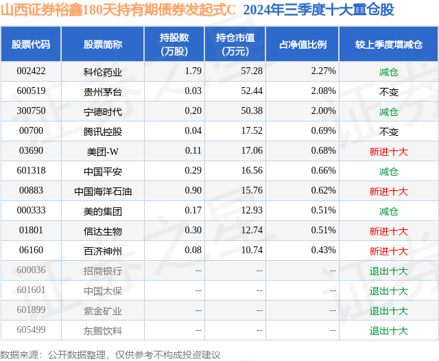 从基金规模来看,山西证券裕鑫180天持有期债券发起式C基金2024年三季度公布的基金规模为0.04亿元,较上一期规模431.88万元变化了-50.55万元,环比变化了-11.7%。该基金最新一期资产配置为:股票占净值比19.97%,债券占净值比81.37%,现金占净值比1.74%。从基金持仓来看,该基金当季前十大股票仓位达10.45%,第一大重仓股为科伦药业(002422),持仓占比为2.27%。