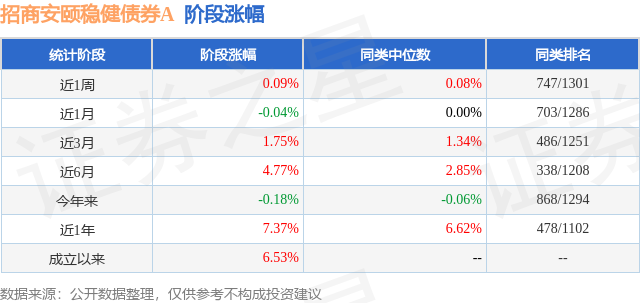 从业绩表现来看,招商安颐稳健债券A基金过去一年净值涨幅为5.46%,在同类基金中排名290/1063,同类基金过去一年净值涨幅中位数为4.0%。而基金过去一年的最大回撤为-3.01%,成立以来的最大回撤为-3.01%。