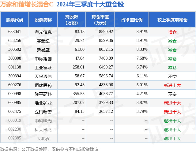 从基金规模来看,万家和谐增长混合C基金2024年三季度公布的基金规模为1.71亿元,较上一期规模4959.22万元变化了1.21亿元,环比变化了243.83%。该基金最新一期资产配置为:股票占净值比84.03%,无债券类资产,现金占净值比17.29%。从基金持仓来看,该基金当季前十大股票仓位达63.56%,第一大重仓股为海光信息(688041),持仓占比为8.91%。