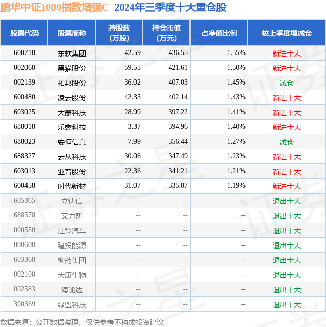 从基金规模来看,鹏华中证1000指数增强C基金2024年三季度公布的基金规模为1.57亿元,较上一期规模1.69亿元变化了-1195.25万元,环比变化了-7.07%。该基金最新一期资产配置为:股票占净值比93.56%,无债券类资产,现金占净值比7.69%。从基金持仓来看,该基金当季前十大股票仓位达13.64%,第一大重仓股为东软集团(600718),持仓占比为1.55%。