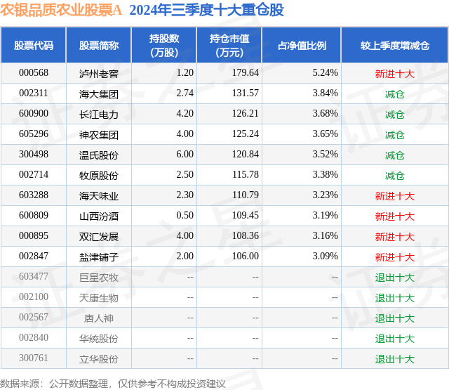 从基金规模来看,农银品质农业股票A基金2024年三季度公布的基金规模为0.15亿元,较上一期规模1527.69万元变化了6.0万元,环比变化了0.39%。该基金最新一期资产配置为:股票占净值比82.01%,无债券类资产,现金占净值比18.39%。从基金持仓来看,该基金当季前十大股票仓位达35.98%,第一大重仓股为泸州老窖(000568),持仓占比为5.24%。