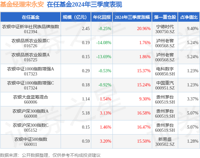 农银品质农业股票A现任基金经理为宋永安。其中在任基金经理宋永安已从业12年又87天,2022年11月22日正式接手管理农银品质农业股票A,任职期间累计回报为-24.69%。目前还管理着9只基金产品(包括A类和C类),其中本季度表现最佳的基金为农银中证新华社民族品牌指数(012394),季度净值涨幅为20.96%。