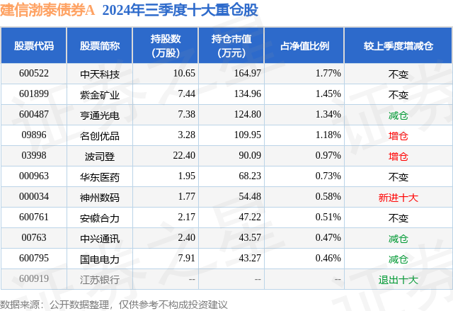 从基金规模来看,建信渤泰债券A基金2024年三季度公布的基金规模为0.87亿元,较上一期规模9138.34万元变化了-466.63万元,环比变化了-5.11%。该基金最新一期资产配置为:股票占净值比14.88%,债券占净值比89.49%,现金占净值比8.31%。从基金持仓来看,该基金当季前十大股票仓位达9.46%,第一大重仓股为中天科技(600522),持仓占比为1.77%。