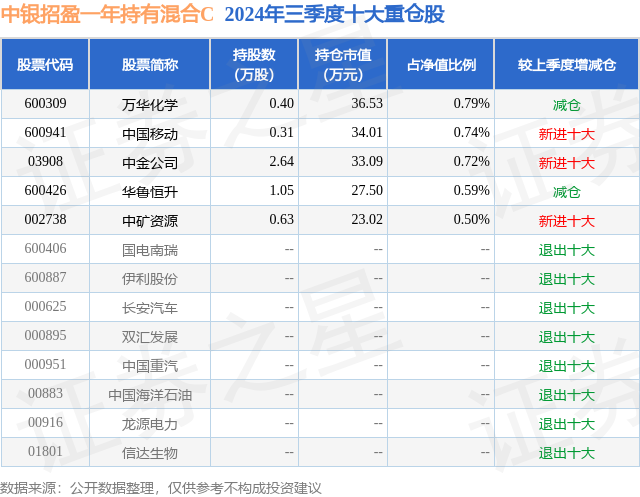 从基金规模来看,中银招盈一年持有混合C基金2024年三季度公布的基金规模为0.13亿元,较上一期规模2181.88万元变化了-877.81万元,环比变化了-40.23%。该基金最新一期资产配置为:股票占净值比3.33%,债券占净值比50.58%,现金占净值比13.28%。从基金持仓来看,该基金当季前十大股票仓位达3.34%,第一大重仓股为万华化学(600309),持仓占比为0.79%。