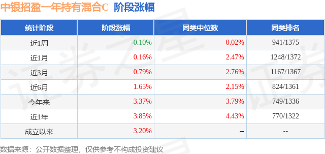 从业绩表现来看,中银招盈一年持有混合C基金过去一年净值涨幅为3.85%,在同类基金中排名770/1322,同类基金过去一年净值涨幅中位数为4.43%。而基金过去一年的最大回撤为-1.69%,成立以来的最大回撤为-2.79%。