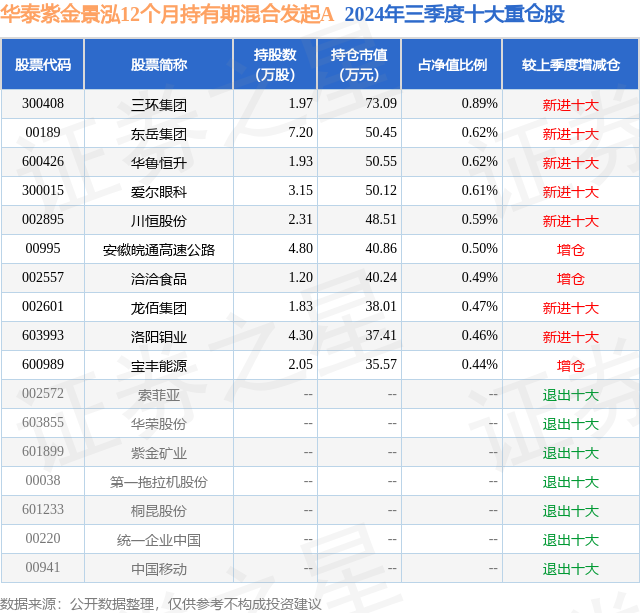 从基金规模来看,华泰紫金景泓12个月持有期混合发起A基金2024年三季度公布的基金规模为0.75亿元,较上一期规模7508.2万元变化了-22.91万元,环比变化了-0.31%。该基金最新一期资产配置为:股票占净值比9.45%,债券占净值比91.91%,现金占净值比2.31%。从基金持仓来看,该基金当季前十大股票仓位达5.69%,第一大重仓股为三环集团(300408),持仓占比为0.89%。