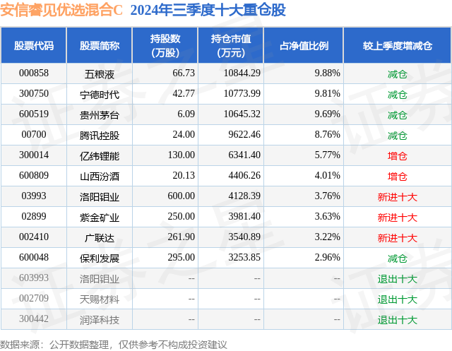 从基金规模来看,安信睿见优选混合C基金2024年三季度公布的基金规模为2.93亿元,较上一期规模2.58亿元变化了3538.36万元,环比变化了13.72%。该基金最新一期资产配置为:股票占净值比91.96%,债券占净值比4.69%,现金占净值比3.21%。从基金持仓来看,该基金当季前十大股票仓位达61.49%,第一大重仓股为五粮液(000858),持仓占比为9.88%。